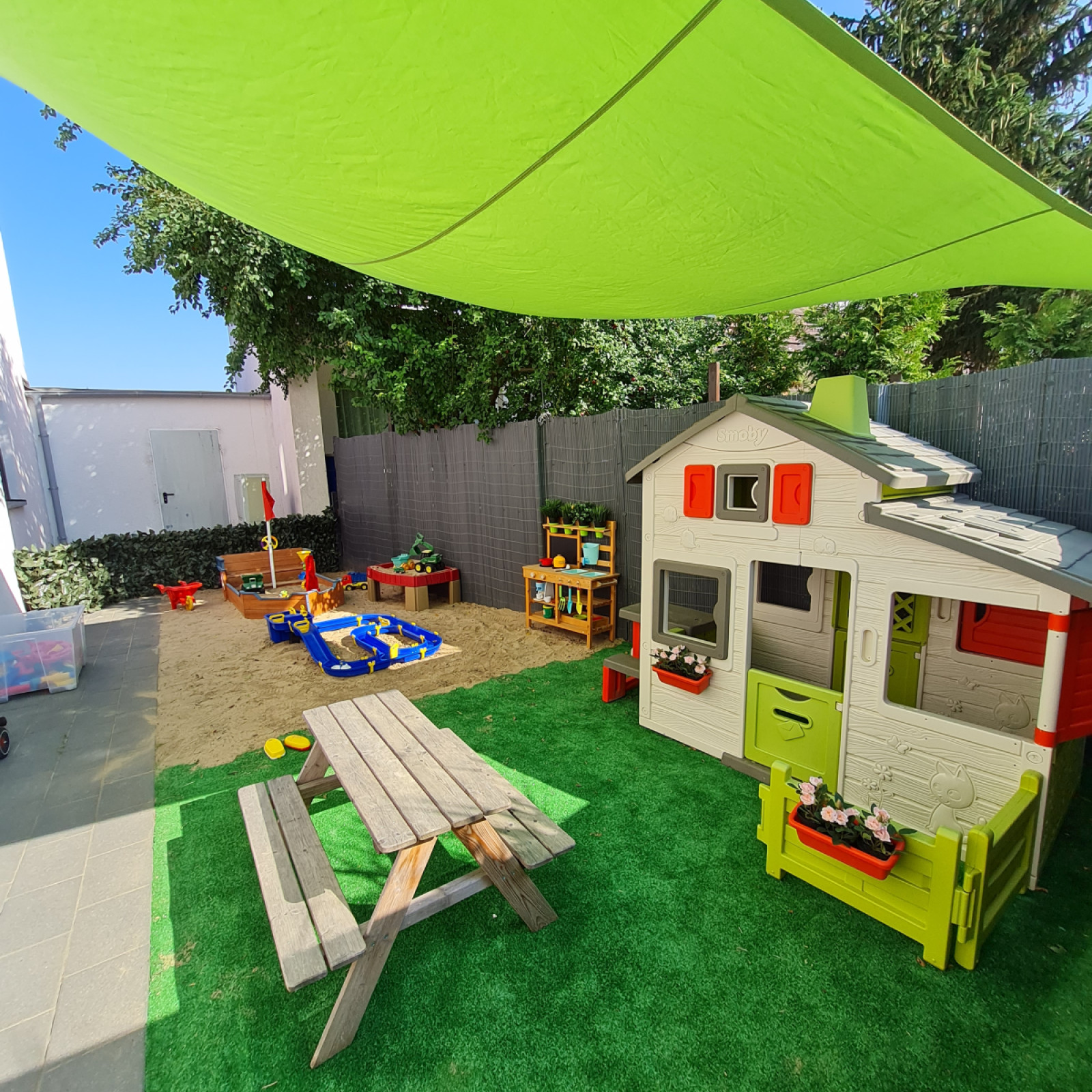 - Ein Sandkasten mit Spielhaus